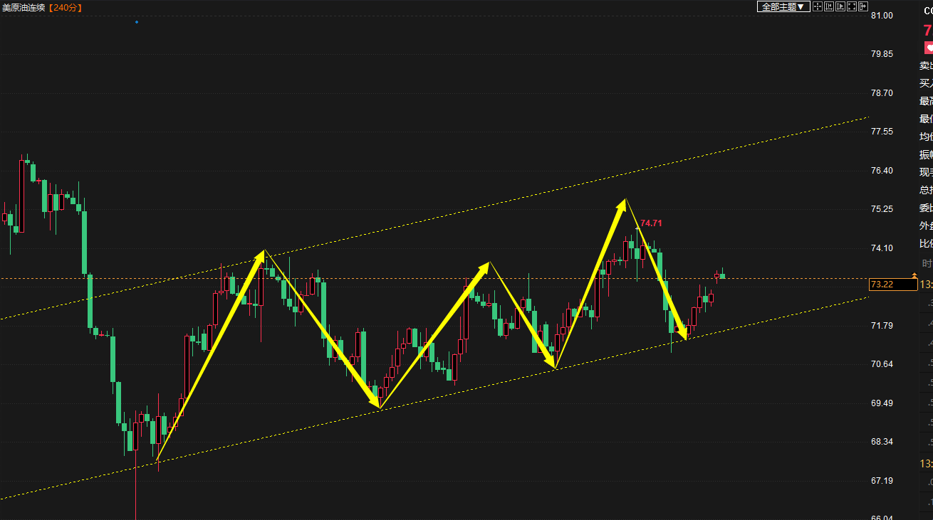 原油认识图是4H的认识图,它是周线深跌后举办的一个大震动修复,周线连绵三周正在这个场所逗留,4H显示它的重心平昔正在抬高,众空趋向并不太显明,咱们正在短线上思绪领略为大震动,日线也是一阴一阳的搭配,不难看出来大震动团体仍是对照强势,操作上找好节律众空都能够上,这日咱们体贴这波众头去测试74上方压制。
