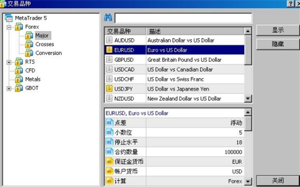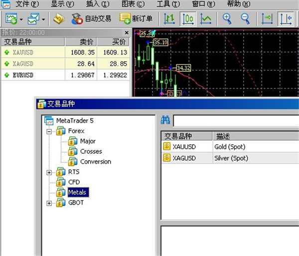 单击后会弹出右键菜单,遴选菜单里的“贸易种类”这里包含MT5全豹能显示行情的种类。贸易种类里有个“Metals”选项,遴选后,会显示出XAUUSD,XAGUSD。这两个一个是黄金,一个是白银。