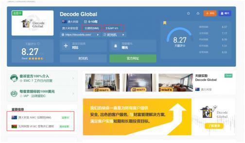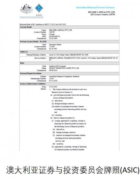 澳大利亚证券与投资委员会执照(ASIC)于2001年遵循澳大利亚《证券和投资委员会法》设立,依法独立对公司、投资活动、金融产物和办事行使拘押性能,现目前澳大利亚证券与投资委员会执照(ASIC)仍然成为了全邦畛域类量度一个平台正道与否的主要目标,Decode Global平台所属的Decode集团能持有ASIC执照,适值解说了其气力之雄厚。