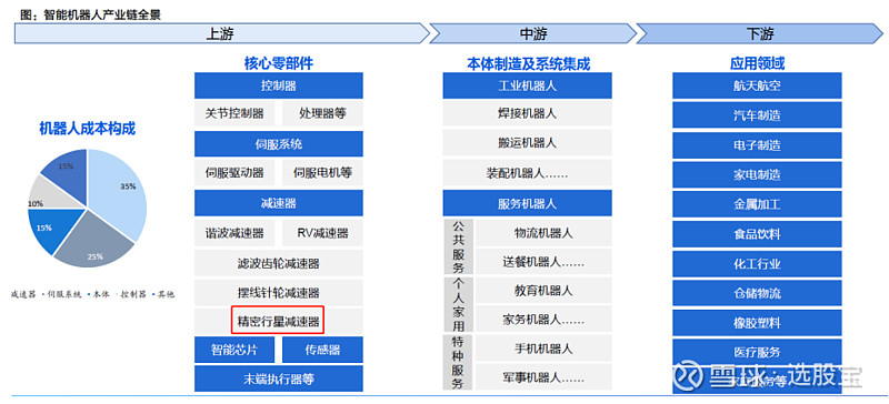 从本钱组成来看,邦盛证券领悟称,减速器、驾御器、伺服体系和等三大零部件是财产链中时间壁垒最高、本钱占比最大的枢纽,本钱占比分辨为35%、10%、25%。