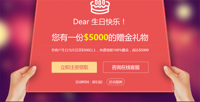 金荣中邦寿辰赠金举止列入办法也很简易,大凡已正在金荣中邦平台激活≥1年的有用客户,并于寿辰前的3个月内有恣意平仓业务纪录,即可列入老客户寿辰赠金举止。客户正在金荣平台激活期间越长,可遴选的寿辰赠金举止层次越众,100%赠金最高可达5000美元,寿辰赠金直接打入金荣钱包,可用于投资业务。