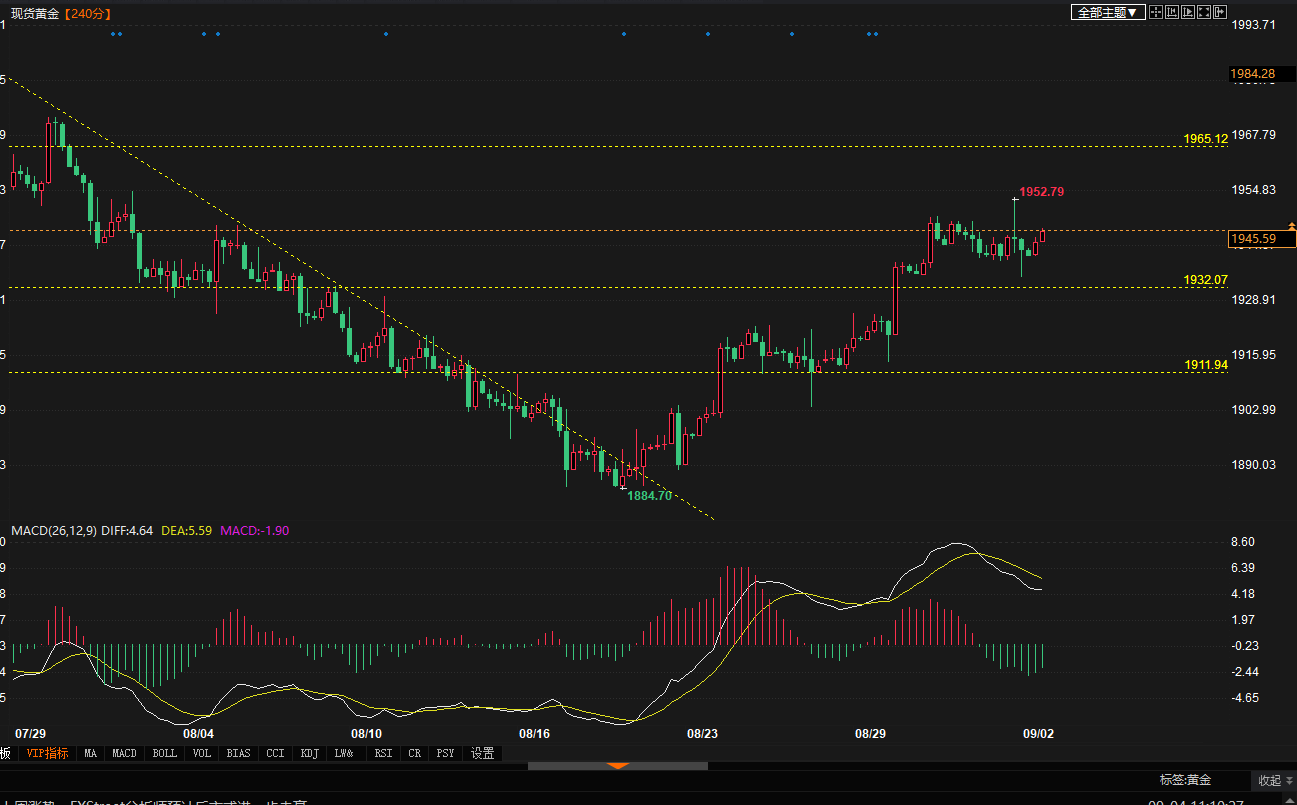今日黄金一连看众 看强势众。1938以上都是强势众头,1945 46一带是短期阻力 冲破站稳后 上方还要去1958-1964、