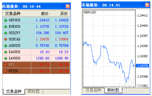 像市集报价,这个窗口列出了MT4平台可买卖的种类以及它们的交易价。窗口下方有两个标签,买卖种类和即时图。买卖种类显示的是可买卖的种类,即时图显示的是所选种类确当前分市价格。