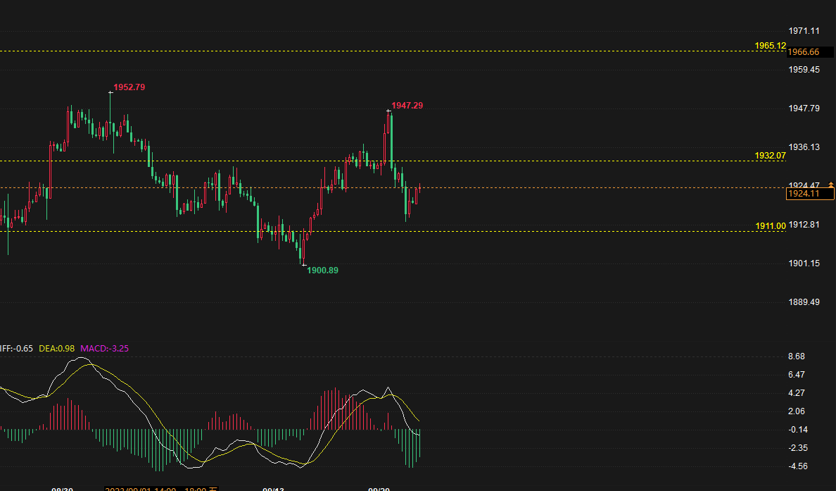 昨日黄金商场延续回落过层,早盘开盘正在1930.8的地方后行情小幅拉升给出1931.5的地方后行情开展回落进程,日线的地方后行情整顿,日线的地方后日线以一根下影线很长的阴线收线。