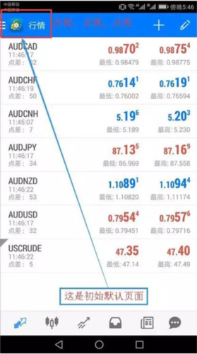 2、进入之后,能够看到这是最初的默认页面。如下图所示点击左上角行情,点那里就能够登录交往账户了;