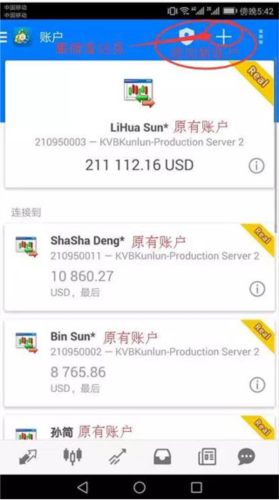4、要是曾经有一个账户了那就点击第二张图中的“+”,就能够连接增加账户了,一个MT4软件能够同时登录许众个交往账户;