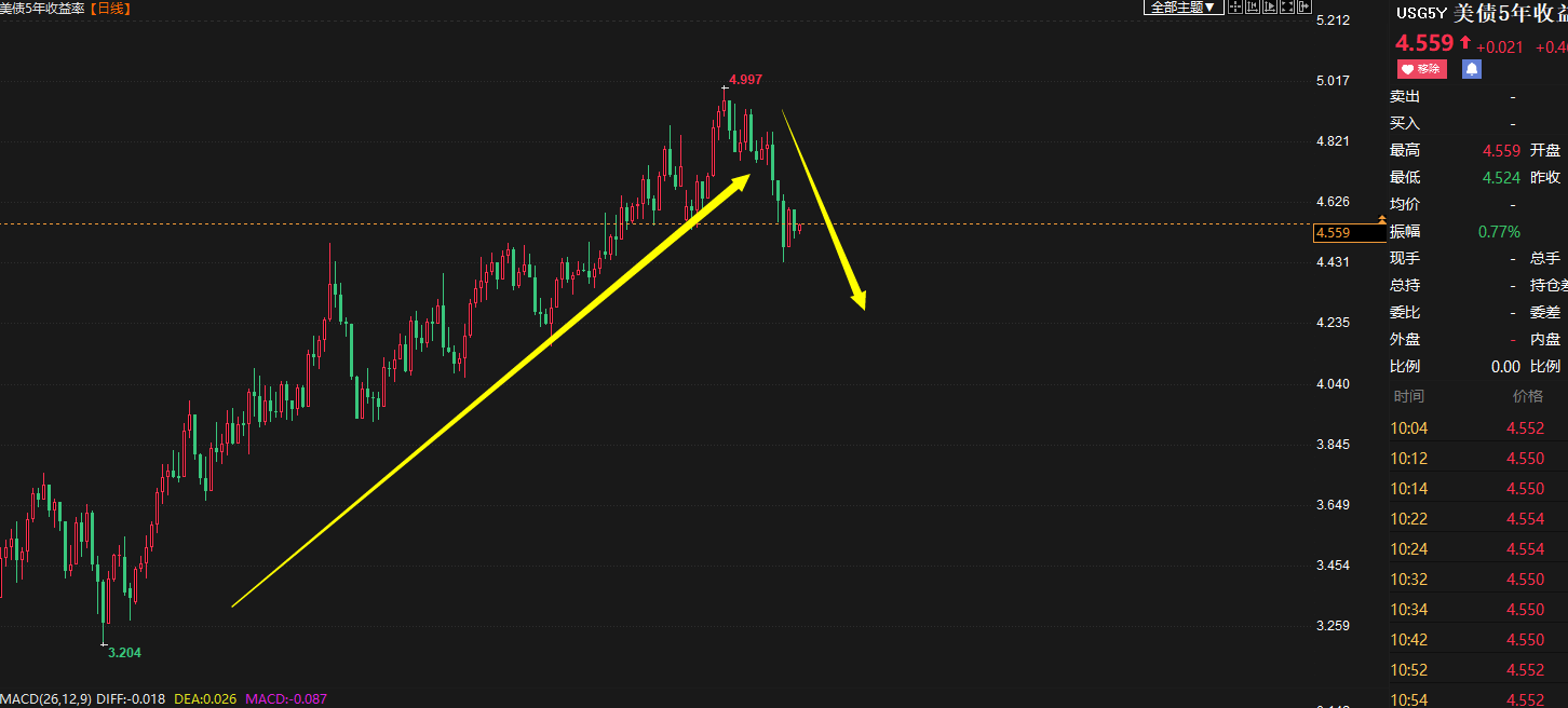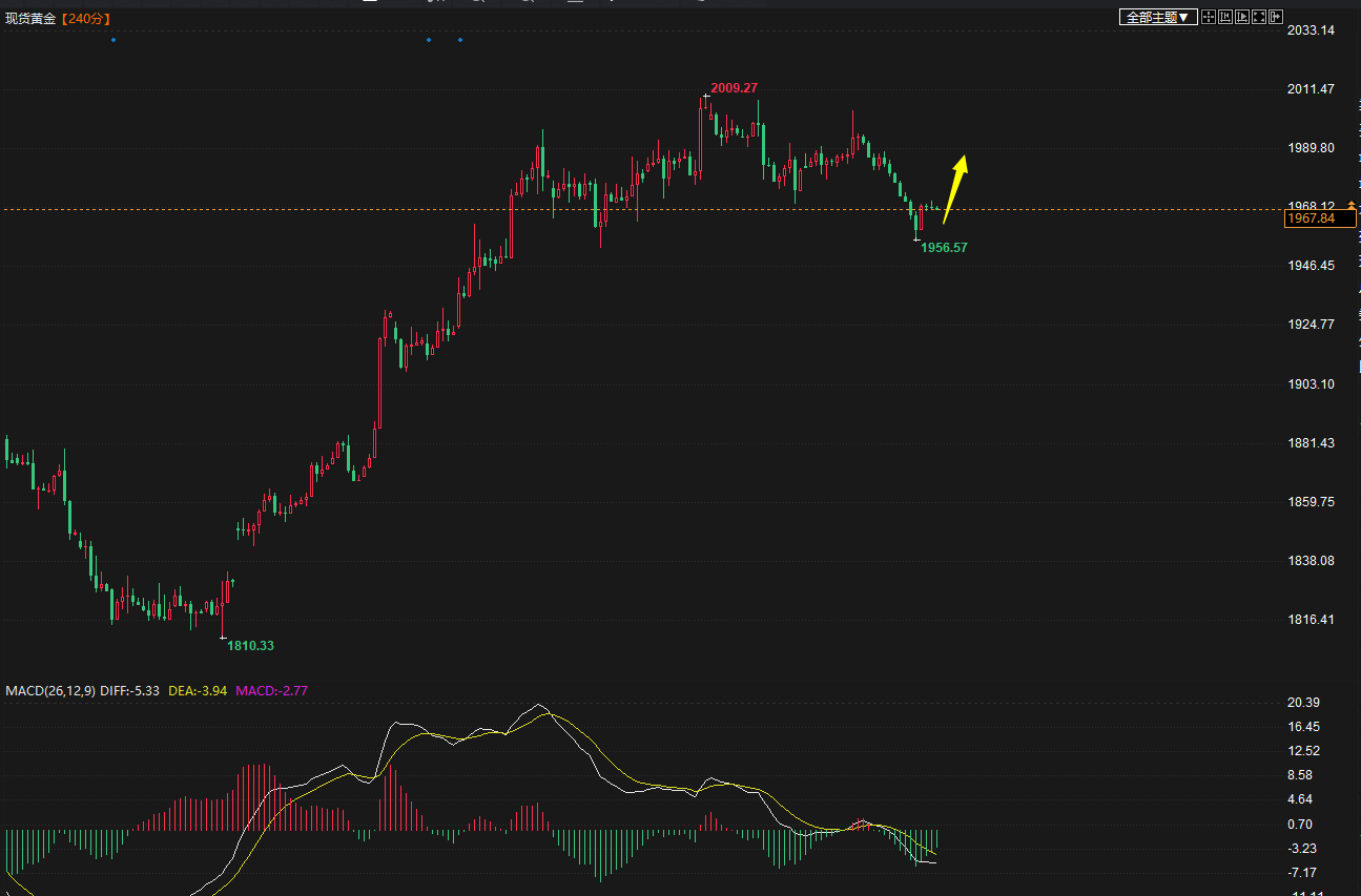 昨日黄金碰到洗盘,从1980左近一起弱势波动回落到1956一带。咱们实盘内提示1958左近会是紧要支柱 攻击区域,到底也证据了这一主见。那么题目来了。黄金是否睹顶了?要大跌了吗?东辉以为,言之过早。最先美元的日线睹顶信号仍然简直清楚走出来,其次美元5年期 10年期邦债收益率不断低落,也有显然睹顶信号。正在如此的布景下 黄金思要大跌 简直概率是比力低的!