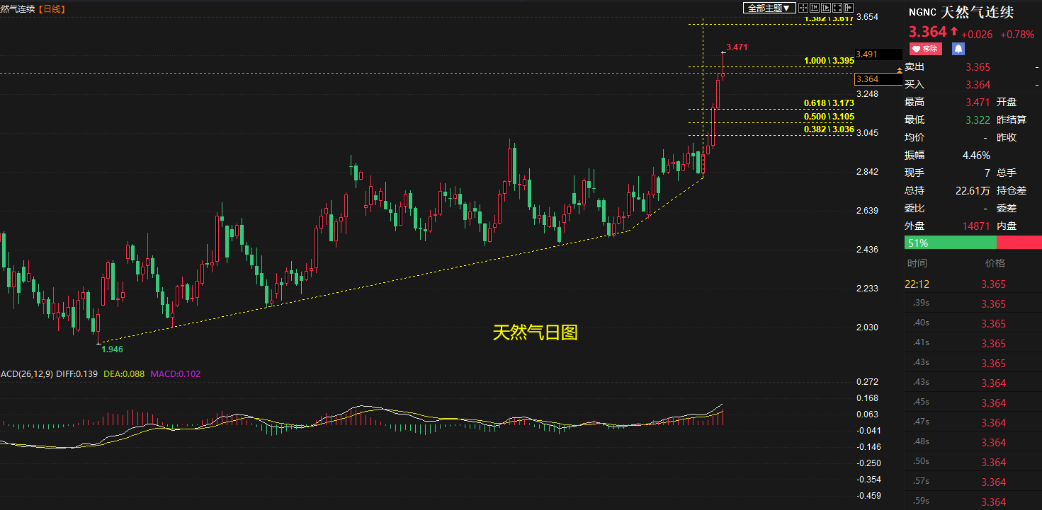 另一个产物,也是咱们本质业务战略中主打种类自然气,本年从4月份初阶,咱们就结构自然气的众头战略,自然气也从最低的2元,一起飙升至目前的3.5,咱们正在近来一次群战略提到自然气会正在11月上旬看到4.3处所区间,把昨年的跳空白口补上,到目前来看,行情走完的70%,然而真正的迅速行情期,或者也就这一个月工夫,咱们维护自然气不停众头到10月底11月初的主见。
