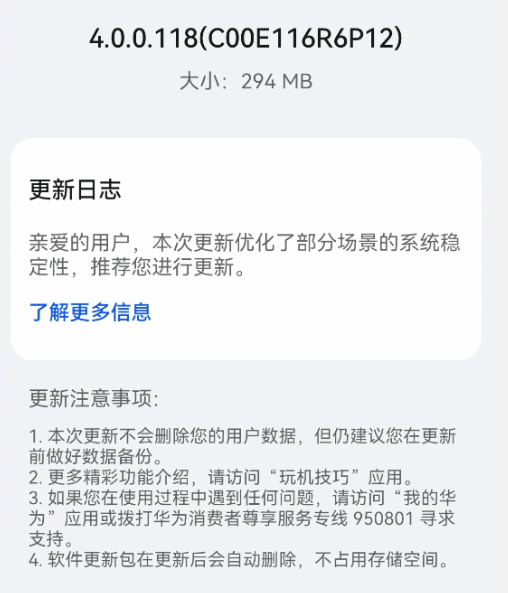 华为这段时候对Mate60、X5系列的体系优化相当经常,现正在又有新版可能升级了。从不少用户的反应看,华为依然推送了鸿蒙OS4.0.0.118版本更新,比拟之前的116来说,体积小了不少唯有294MB支配。不管奈何说,跟着后续鸿蒙4体系的连接优化,这款管束器还能迸发出更众惊喜。