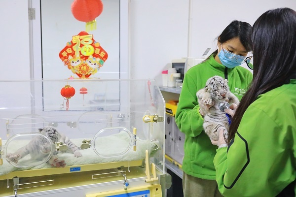 2月5日,南通丛林野灵便物园的育小室里笑逐颜开,刚出生一周的双胞胎小白虎迎来了“虎生”第一次体检。