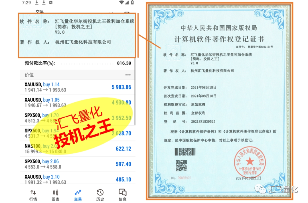 【图利之王】是杭州汇飞量化科技有限公司研发的首款MT5版本贸易化EA计谋:目前仍然赢得了中邦邦度版权局常识产权证书,证书编号:2021SR1539525。