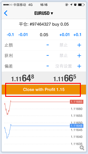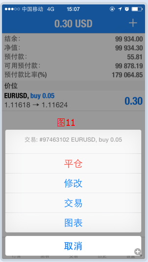 (6)平仓或改正订单。点击订单,显现图11下方窗口,遴选订单操作。会显现图12窗口,提示现有赢余情景,点击CLOSE WITH PROFIT…,则平仓告成,完毕营业。