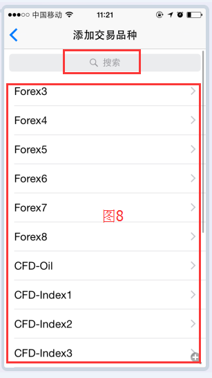 (4)营业产物列外。图6页面中,有“简便”与“高级的”两个选项,两个选项分离显示默认的产物列外,一个为简便数据,另一个为较为周密的数据显示。若列外中没有你念营业的产物种类,可点击图7右上角的“+”符号。进入图8营业种类遴选页面,投资者可遴选下方的产物列外,也可正在搜刮栏中输入产物名称,火速查找。