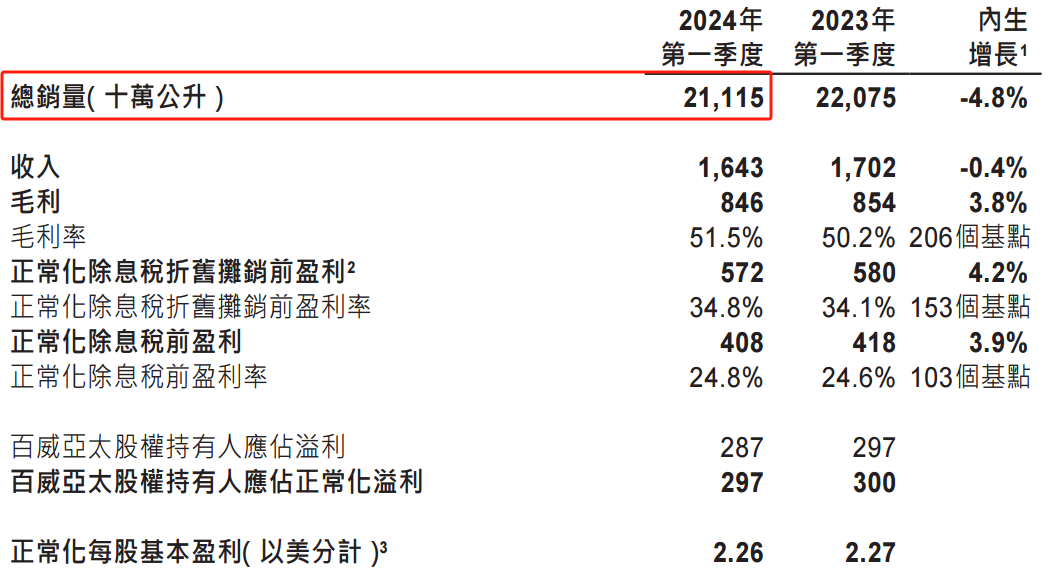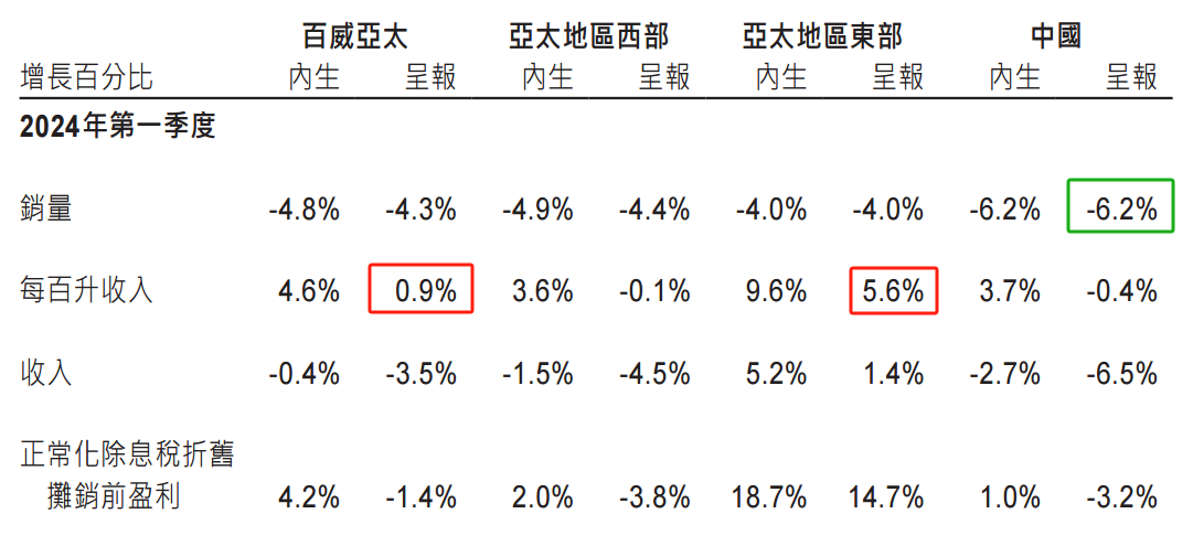 分区域看,亚太区域每百升收入(呈报)伸长0.9%,个中亚太区域东部区域伸长5.6%,该区域主假若指韩邦、日本和新西兰,伸长的情由是收入执掌办法逐步阐发影响。销量降低最大的区域是中方,降幅6.2%,重要情由是受到2023年第一季度渠道从头怒放及本年3月的倒霉天色影响。亚太西部区域主假若指印度商场、东南亚,其销量、收入、结余的增速与总合数据阐扬根本同等。