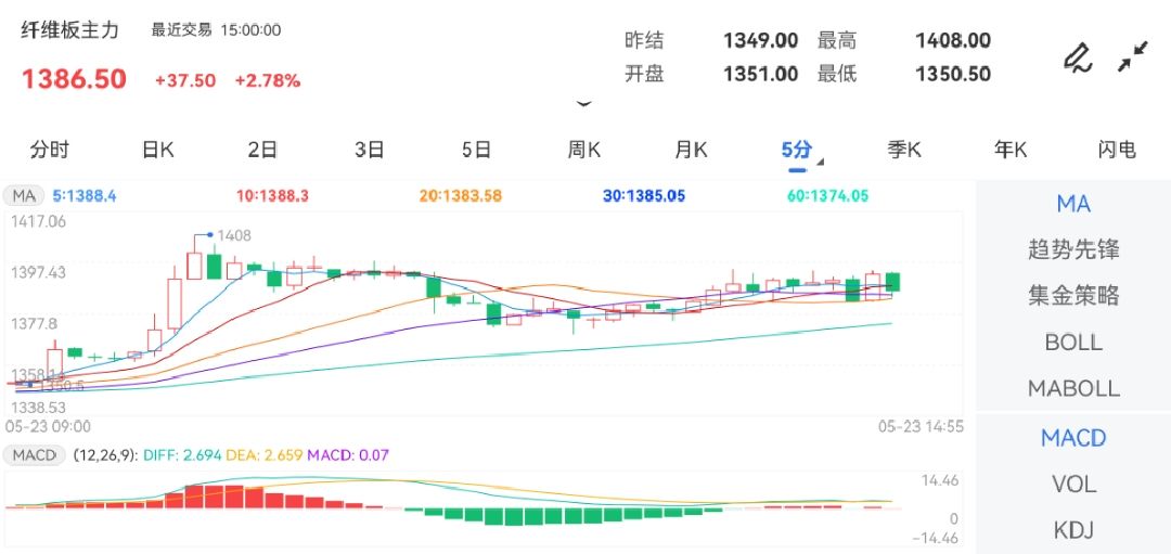 金投网APP行情中央数据显示,截止2024年5月23日下昼15:00收盘,纤维板期货主力合约行情讯息:最新价:1386.50,涨跌:37.50,涨跌幅:2.78%,成交量:29404.00手,开盘价:1351.00,昨收价:1351.50,最高价:1408.00,最低价:1350.50。