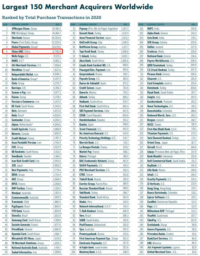 今天,环球出名银行卡和转移付出行业调研机构HSN Consultants, Inc.正在Nilson Report(“尼尔森申诉”第1206期)中正式公告《2020年度环球收单机构排名外》,银联商务以高达117.46亿笔全卡种清理往还笔数位列第六。