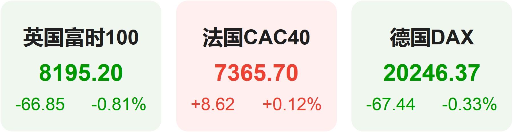 欧洲股市方面,英邦富时100指数小幅下跌0.81%,报8195点。法邦CAC40指数小幅上涨0.12%,报7366点。德邦DAX指数小幅下跌0.33%,报20246点。
