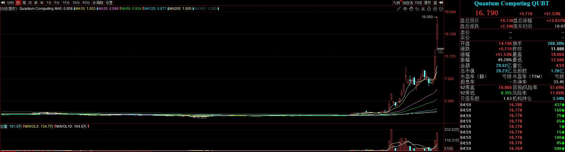 商场对量子科技插手人工智能的潜力充满热诚,周一QuantumComputing领涨量子股,一夜飙升65.25%,过去一个月该股累计涨幅进步360%;RigettiComputing成交量进步了美债ETF—TLT,D-WaveQuantum成交量进步了伯克希尔。