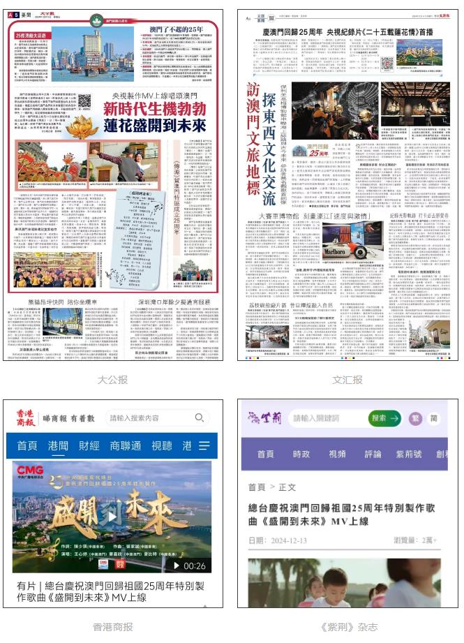 连日来,《怒放到来日》正在澳门区域掀起高潮。澳门日报、澳广视、澳门明言传媒等澳门各家媒体主动转发报道,澳门塔等首要地标处的超高清大屏全天滚动播出MV。有澳门住民外现,歌曲朗朗上口,一听就禁不住跟唱。通过《怒放到来日》,新时期澳门同胞坚强爱邦爱澳、勤勉装备梓乡的美妙愿景正在澳门本地渊博撒布。
