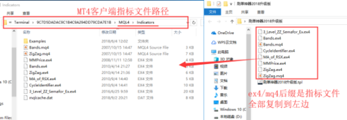 4、将目标文献(ex4/mq4后缀形式文献)总计复制到MT4客户端的目标文献旅途“\MQL4\Indicators”下,如下图: