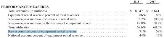 修筑利用率亲切70%;大客户占比70%;出租率是修筑租赁生意的第一大困难,成长环节客户(Key Accounts),异常是世界性客户(National Accouts)是降低出租率的主要措施之一。环节客户带来了永恒、安祥的互助相合,收入占比约70%,这是URI均匀修筑出租率不断庇护正在70%旁边的根底。