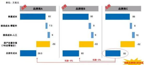以总具有本钱(TCO,Total Cost of Ownership),而非采购扣头举动决议尺度,更接近真正回报。总具有本钱=购买本钱+维修本钱(含配件和人工)- 二手解决价格。总具有本钱最优,能够避免“寻求短期长处”的陷坑。