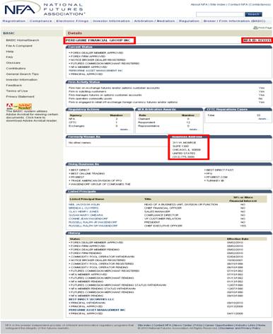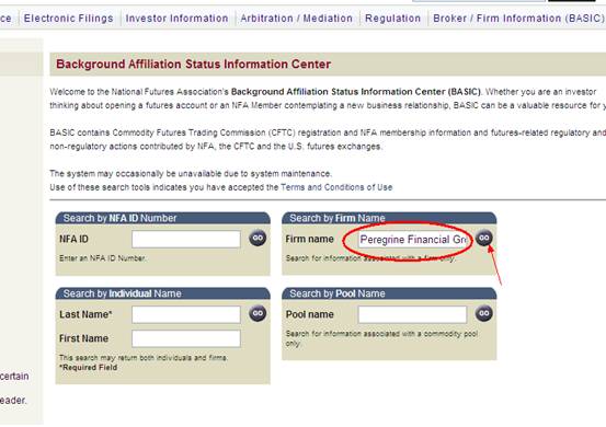 第三步:正在NFAID中输入监禁号,比方美邦百利金融集团有限公司(Peregrine Financial Group)的监禁号为“0232217”,点击“go”。或者正在Firm name中输入美邦百利金融集团有限公司的英文名称“Peregrine Financial Group”,点击“go”,也可能。