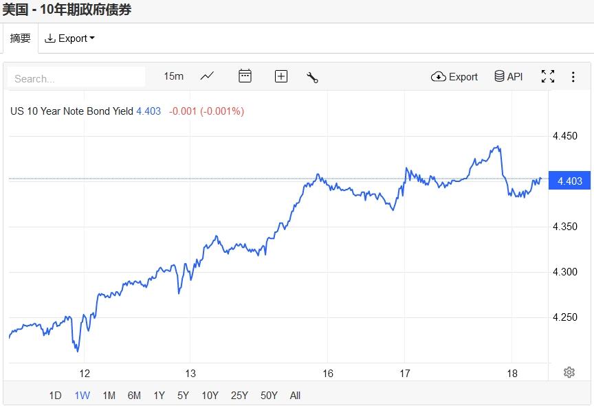 美债收益率根基持平,盘中触及一个月来的高点,10年期美债收益率收报4.403%,对利率加倍敏锐的两年期美债收益率收报4.266%。